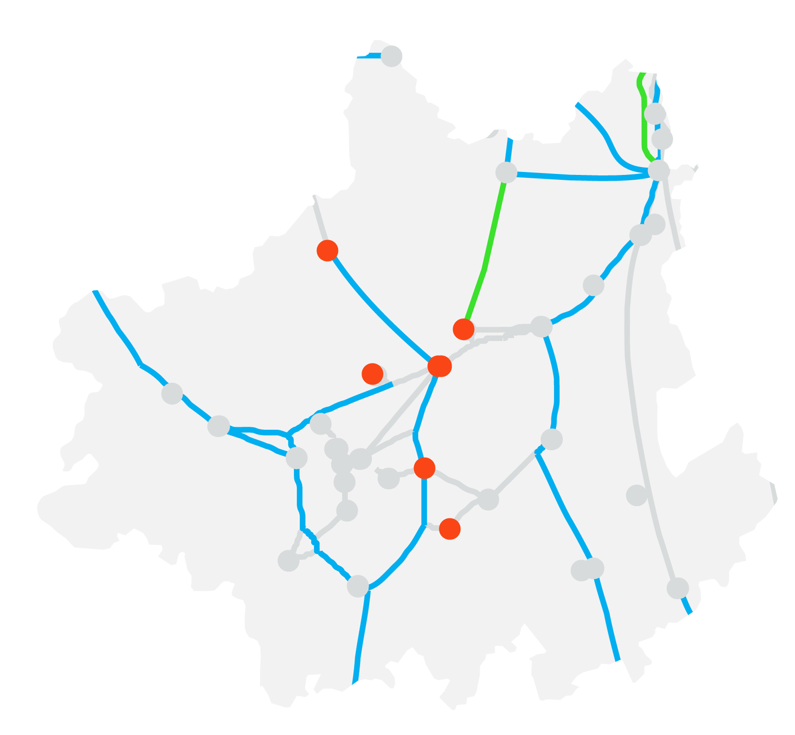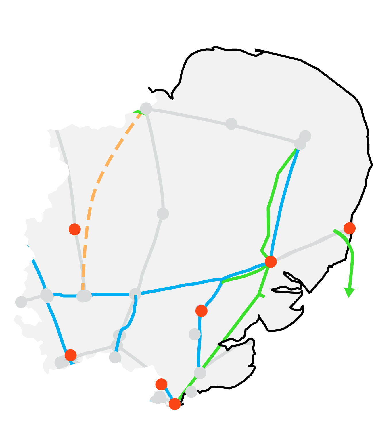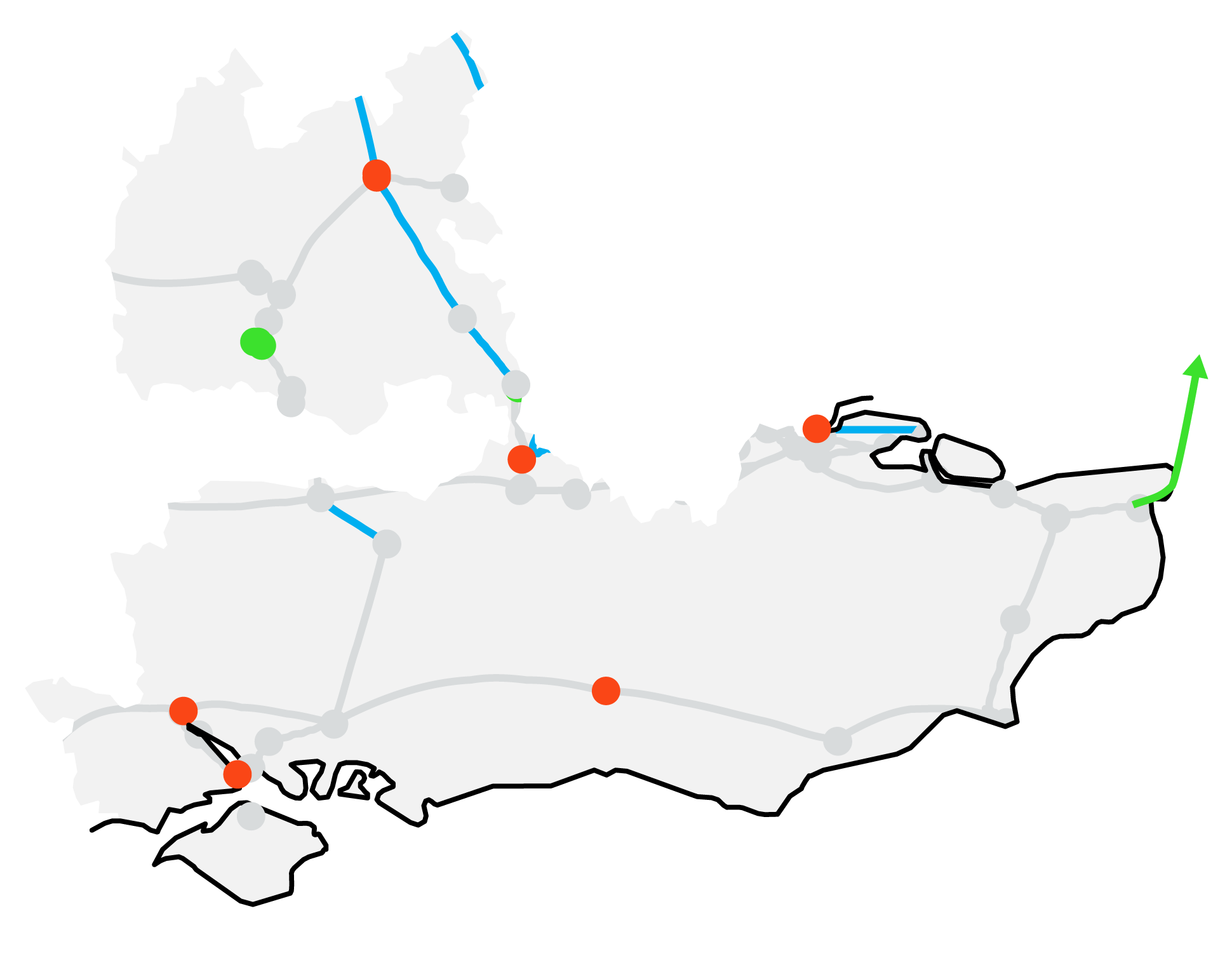 This network region reflects the geographical area of the South East, excluding the route corridor into London covered in the South West network. It does not include Greater London.