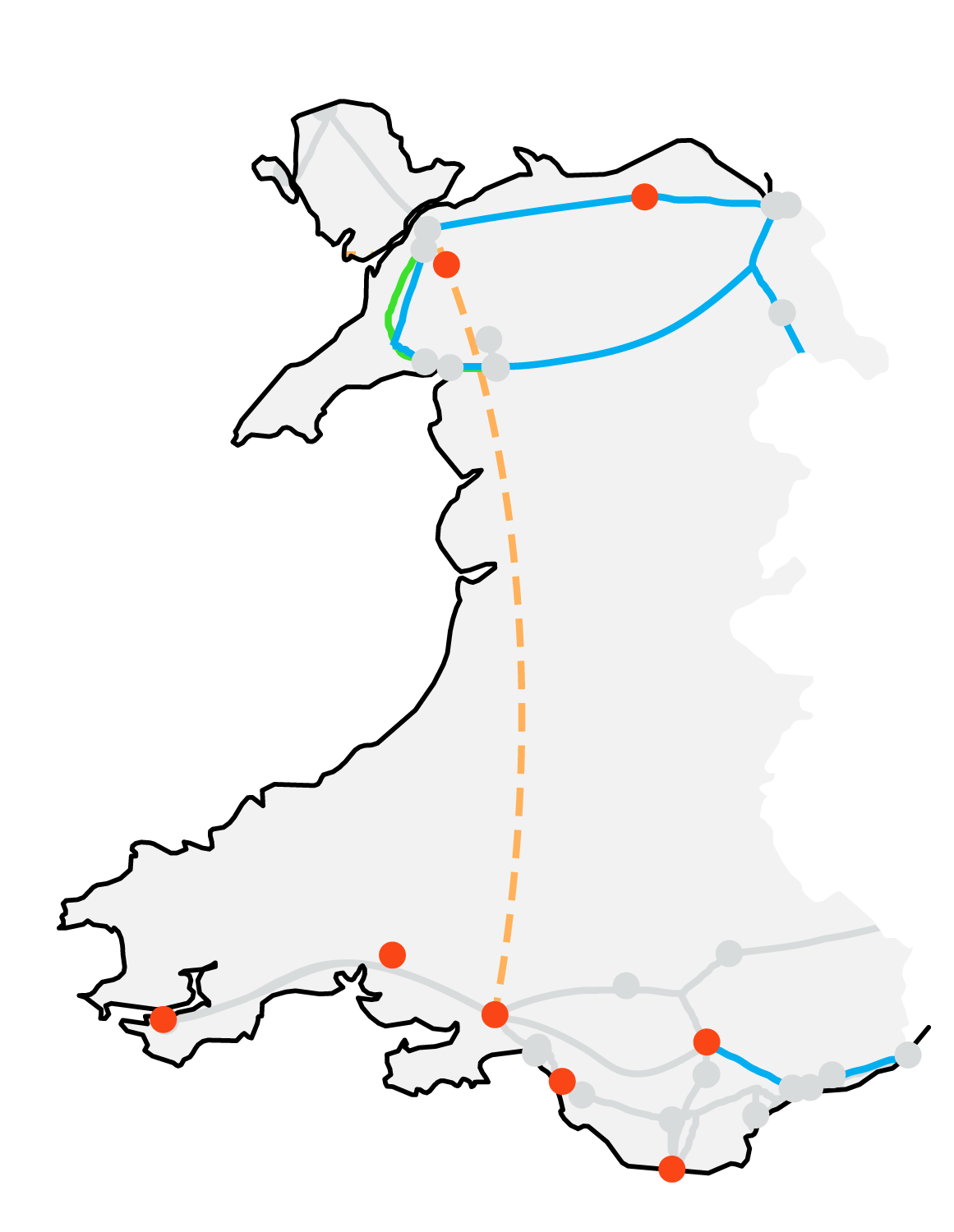 This network region reflects the geographical area of the country of Wales, but with some network included and excluded from parts of neighbouring regions.